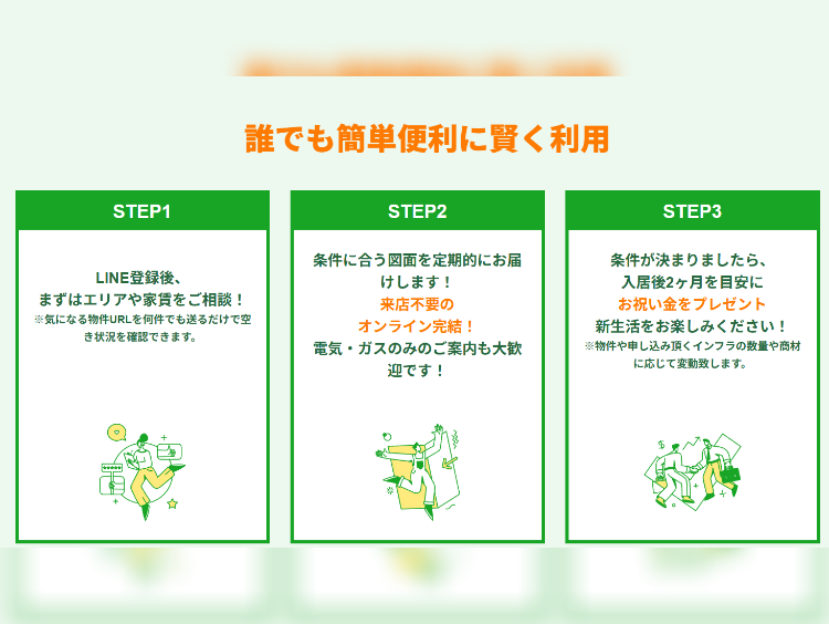 お部屋探しにかかる仲介手数料を最大無料にし、さらに入居お祝い金までプレゼントする、圧倒的な利用者還元型の不動産サービスです。